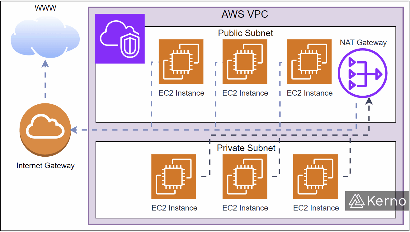 - Public Subnet: Connected to the Internet Gateway; resources can receive inbound/outbound internet traffic.