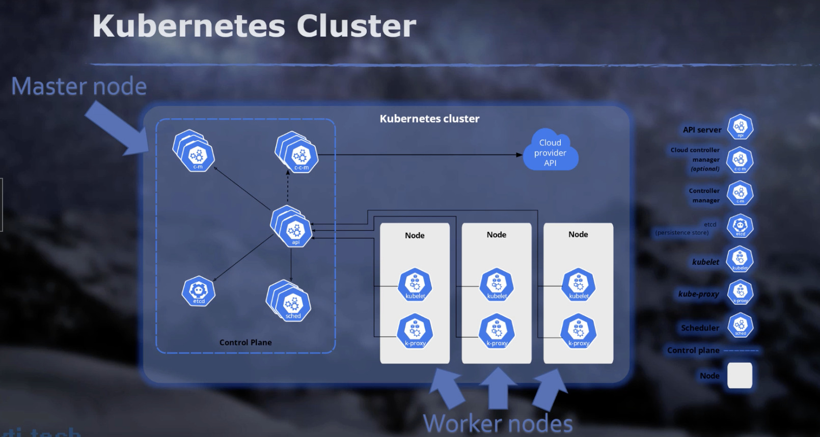 - kube-scheduler (sched) -> Where K8s work planning is done. It monitors newly created or unassigned Pods and selects a node for them to run on. (Pod = container) When making this selection, it evaluates various parameters such as CPU, Ram, etc. and decides which node is most suitable for the pod through a selection algorithm.
