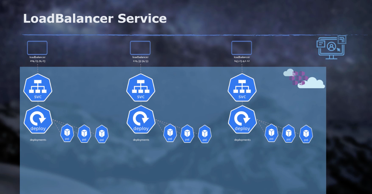 In cloud environments like Azure, organizations define LoadBalancer services within clusters. Cloud providers assign IP addresses to these LoadBalancer services, and all requests directed to these IPs are handled by the LoadBalancer. Domain names are matched with IP addresses through DNS, enabling user access.