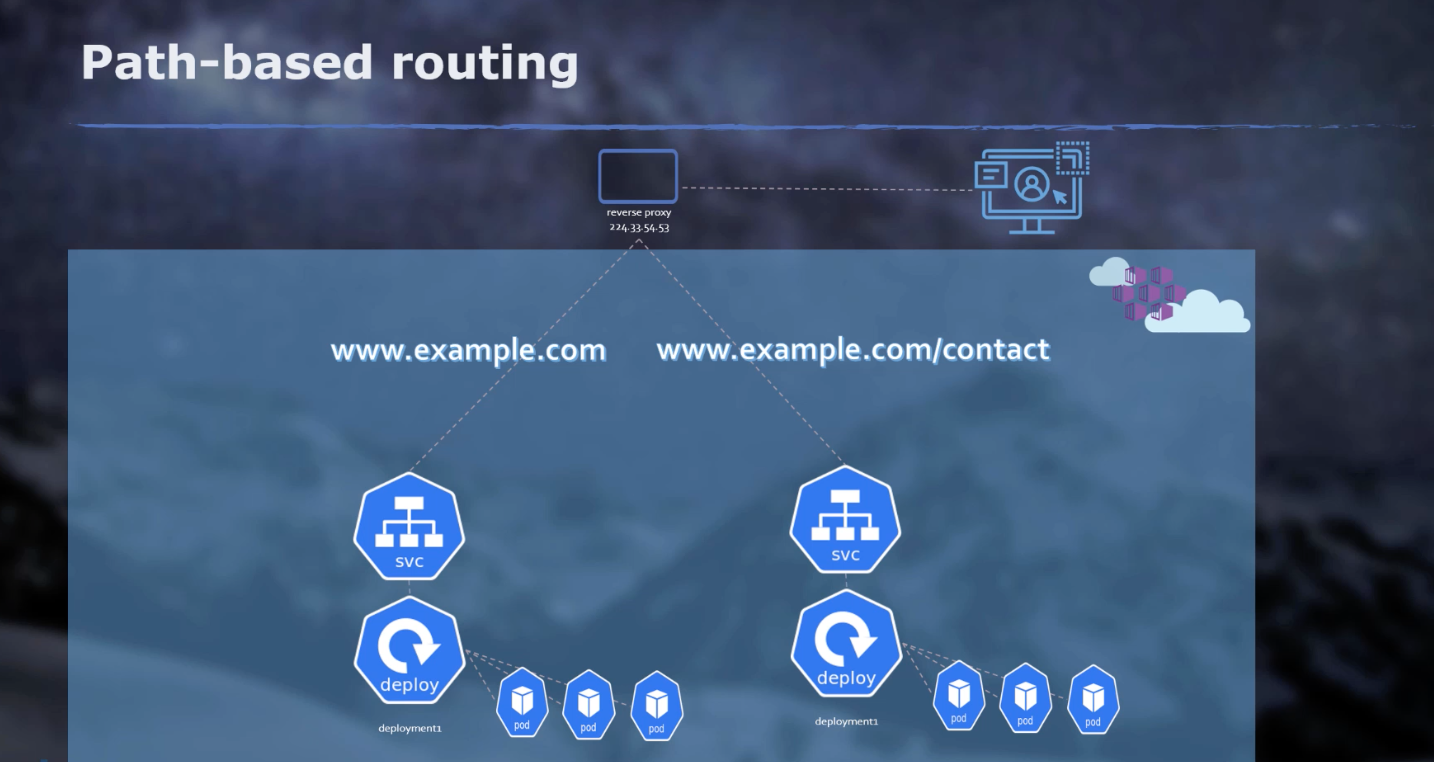 In this scenario: when users visit example.com, application A runs; when they visit example.com/contact, application B runs. LoadBalancer services cannot handle this setup because /contact paths cannot be defined in DNS. However, a load balancer that functions like a gateway is required to welcome users in all scenarios.
